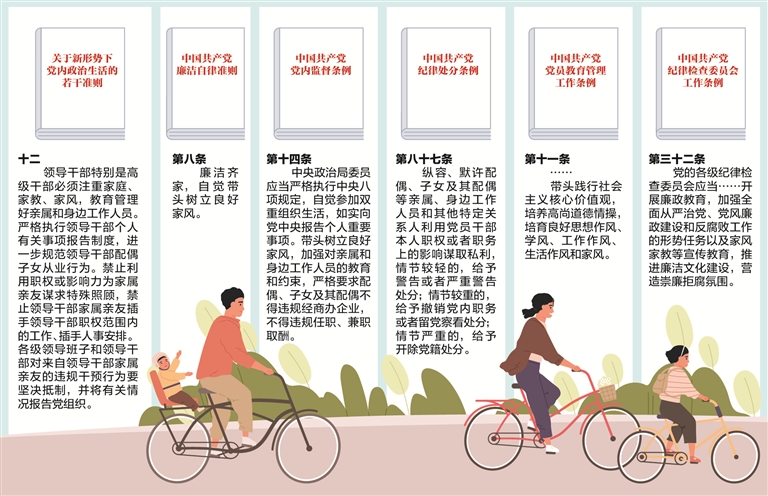 《中国共产党廉洁自律准则》将廉洁齐家列为党员领导干部廉洁自律规范的一项重要内容;《中国共产党纪律处分条例》规定:“党员领导干部不重视家风建设,对配偶、子女及其配偶失管失教,造成不良影响或者严重后果的,给予警告或者严重警告处分;情节严重的,给予撤销党内职务处分。”以党内法规形式对领导干部家风建设提出明确要求。