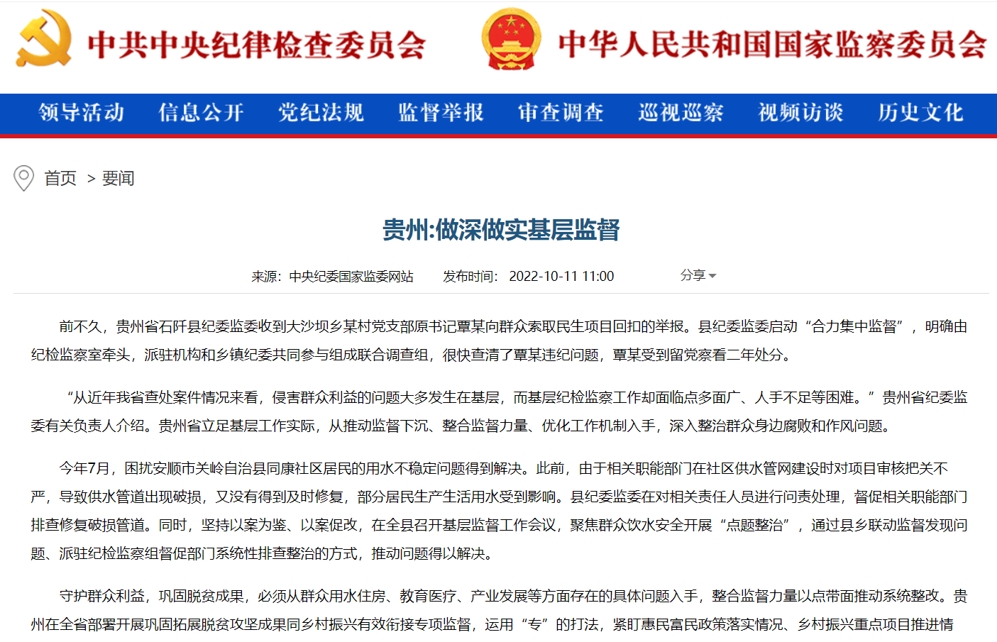 今年7月,困扰安顺市关岭自治县同康社区居民的用水不稳定问题得到解决。此前,由于相关职能部门在社区供水管网建设时对项目审核把关不严,导致供水管道出现破损,又没有得到及时修复,部分居民生产生活用水受到影响。县纪委监委在对相关责任人员进行问责处理,督促相关职能部门排查修复破损管道。同时,坚持以案为鉴、以案促改,在全县召开基层监督工作会议,聚焦群众饮水安全开展“点题整治”,通过县乡联动监督发现问题、派驻纪检监察组督促部门系统性排查整治的方式,推动问题得以解决。