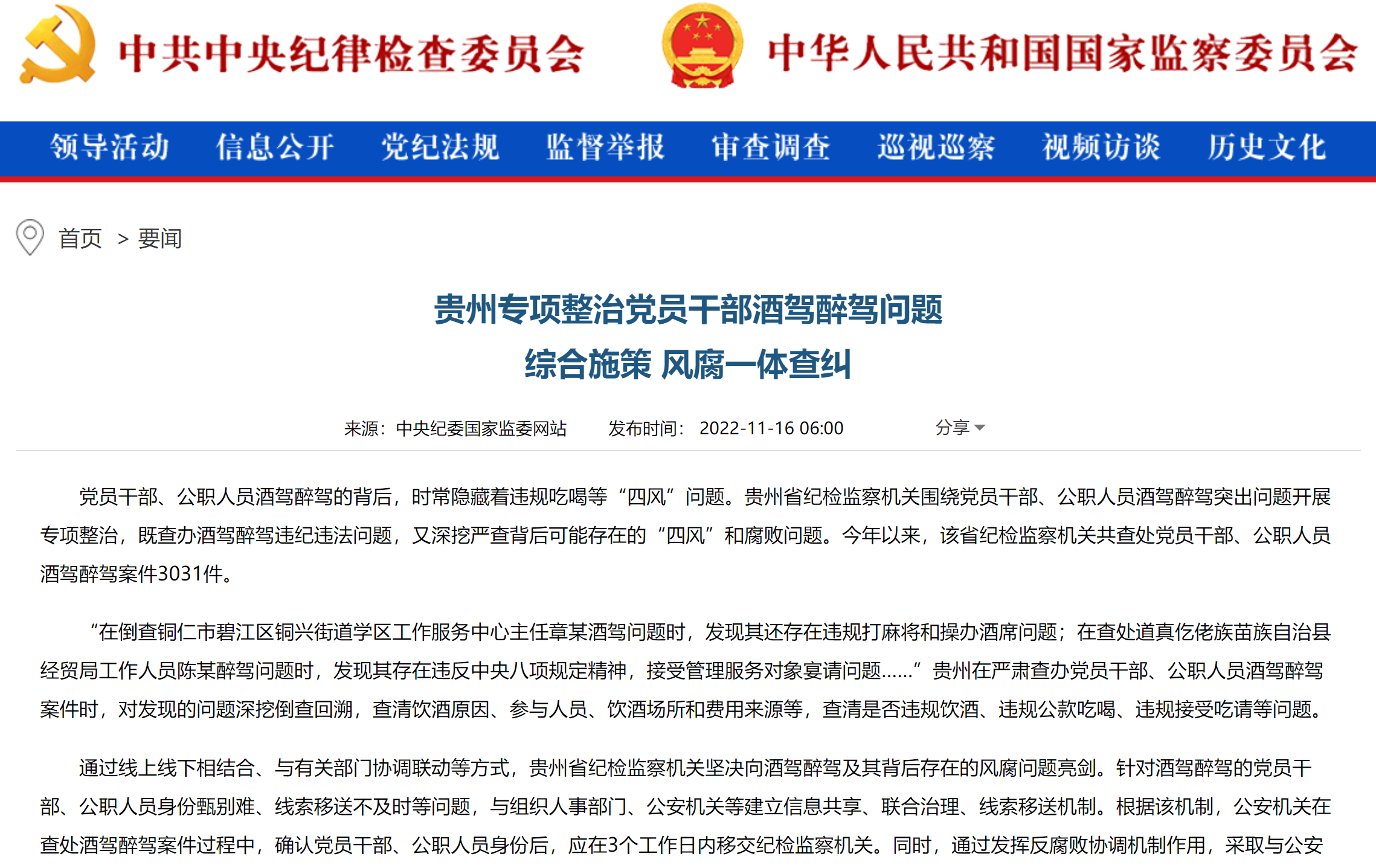 通过线上线下相结合、与有关部门协调联动等方式,贵州省纪检监察机关坚决向酒驾醉驾及其背后存在的风腐问题亮剑。针对酒驾醉驾的党员干部、公职人员身份甄别难、线索移送不及时等问题,与组织人事部门、公安机关等建立信息共享、联合治理、线索移送机制。根据该机制,公安机关在查处酒驾醉驾案件过程中,确认党员干部、公职人员身份后,应在3个工作日内移交纪检监察机关。同时,通过发挥反腐败协调机制作用,采取与公安机关、宣传、组织人事等部门联合集中检查等方式,既监督查处酒驾醉驾行为,又跟进监督隐瞒不报、压案不查、包庇袒护等问题。