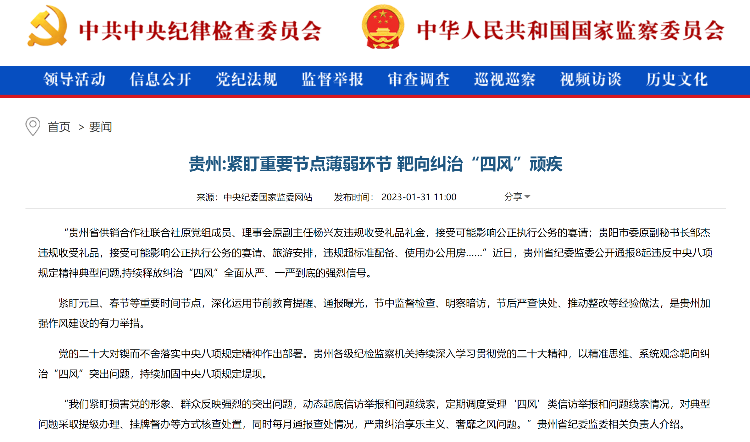 “我们紧盯损害党的形象、群众反映强烈的突出问题,动态起底信访举报和问题线索,定期调度受理‘四风’类信访举报和问题线索情况,对典型问题采取提级办理、挂牌督办等方式核查处置,同时每月通报查处情况,严肃纠治享乐主义、奢靡之风问题。”贵州省纪委监委相关负责人介绍。