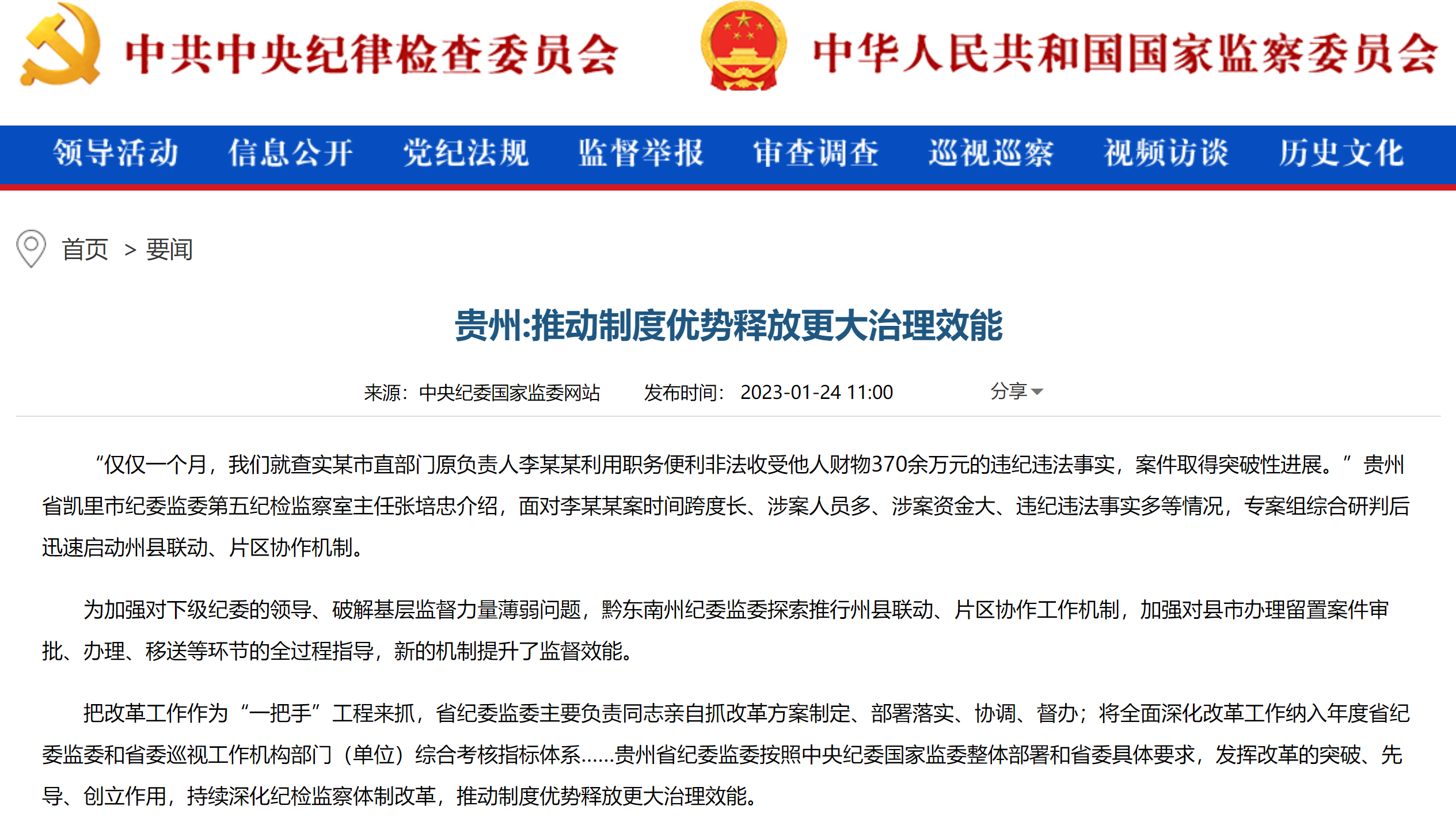 把改革工作作为“一把手”工程来抓,省纪委监委主要负责同志亲自抓改革方案制定、部署落实、协调、督办;将全面深化改革工作纳入年度省纪委监委和省委巡视工作机构部门(单位)综合考核指标体系……贵州省纪委监委按照中央纪委国家监委整体部署和省委具体要求,发挥改革的突破、先导、创立作用,持续深化纪检监察体制改革,推动制度优势释放更大治理效能。