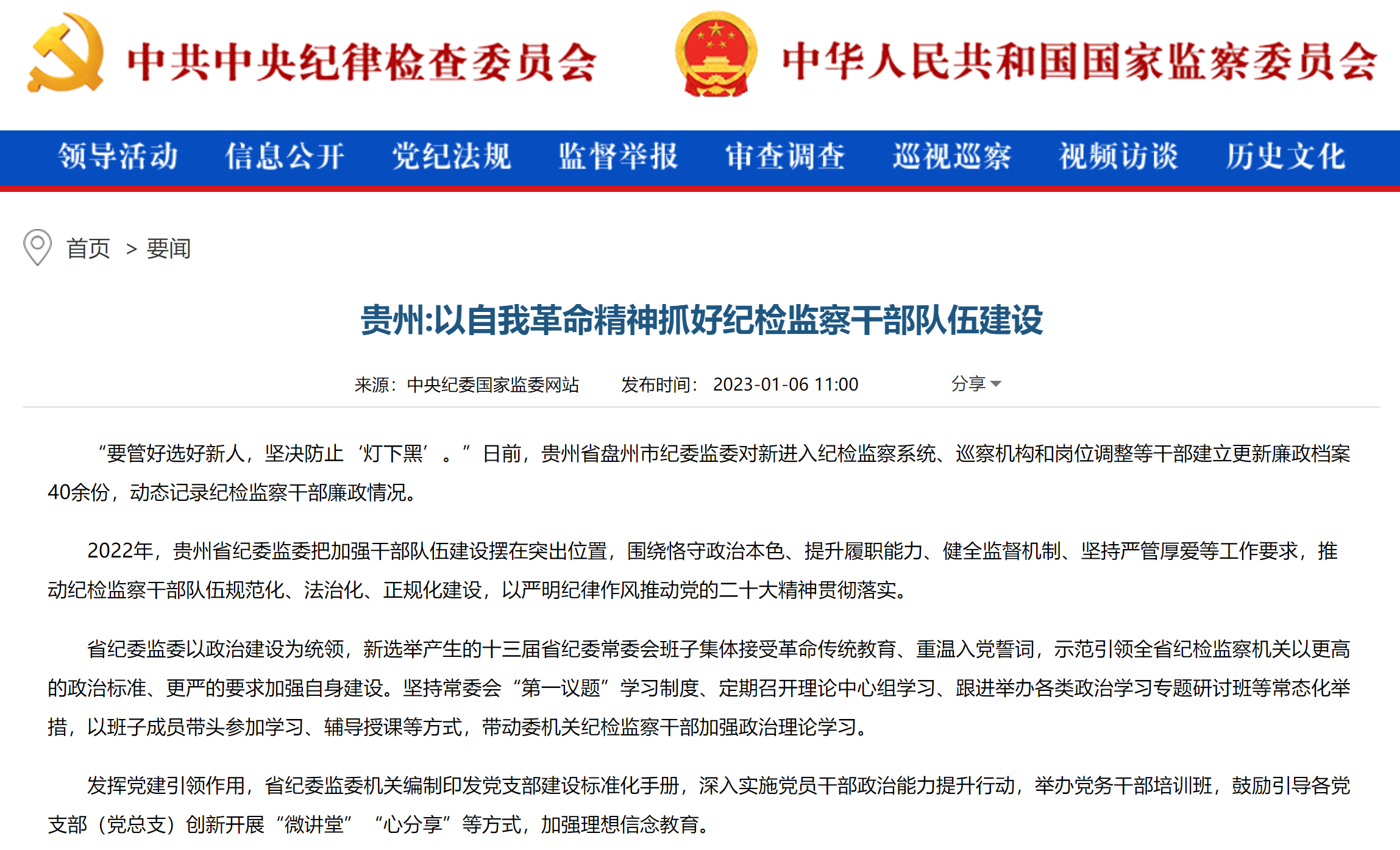2022年,贵州省纪委监委始终把加强干部队伍建设摆在突出位置,围绕恪守政治本色、提升履职能力、健全监督机制、坚持严管厚爱等工作要求,推动纪检监察干部队伍规范化、法治化、正规化建设,以严明纪律作风推动党的二十大精神贯彻落实。