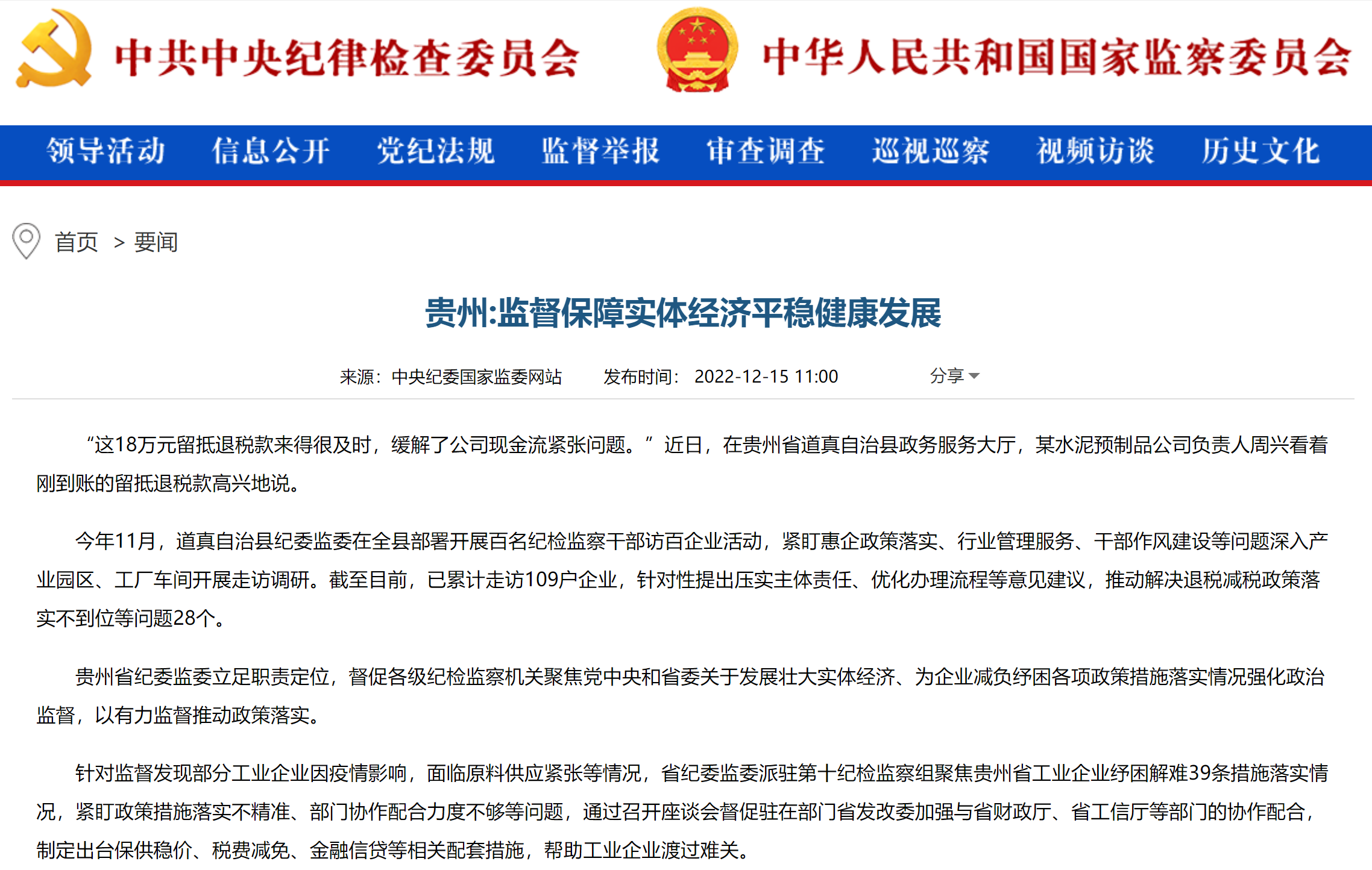 贵州省纪委监委立足职责定位,督促各级纪检监察机关聚焦党中央和省委关于发展壮大实体经济、为企业减负纾困各项政策措施落实情况强化政治监督,以有力监督推动政策落实。