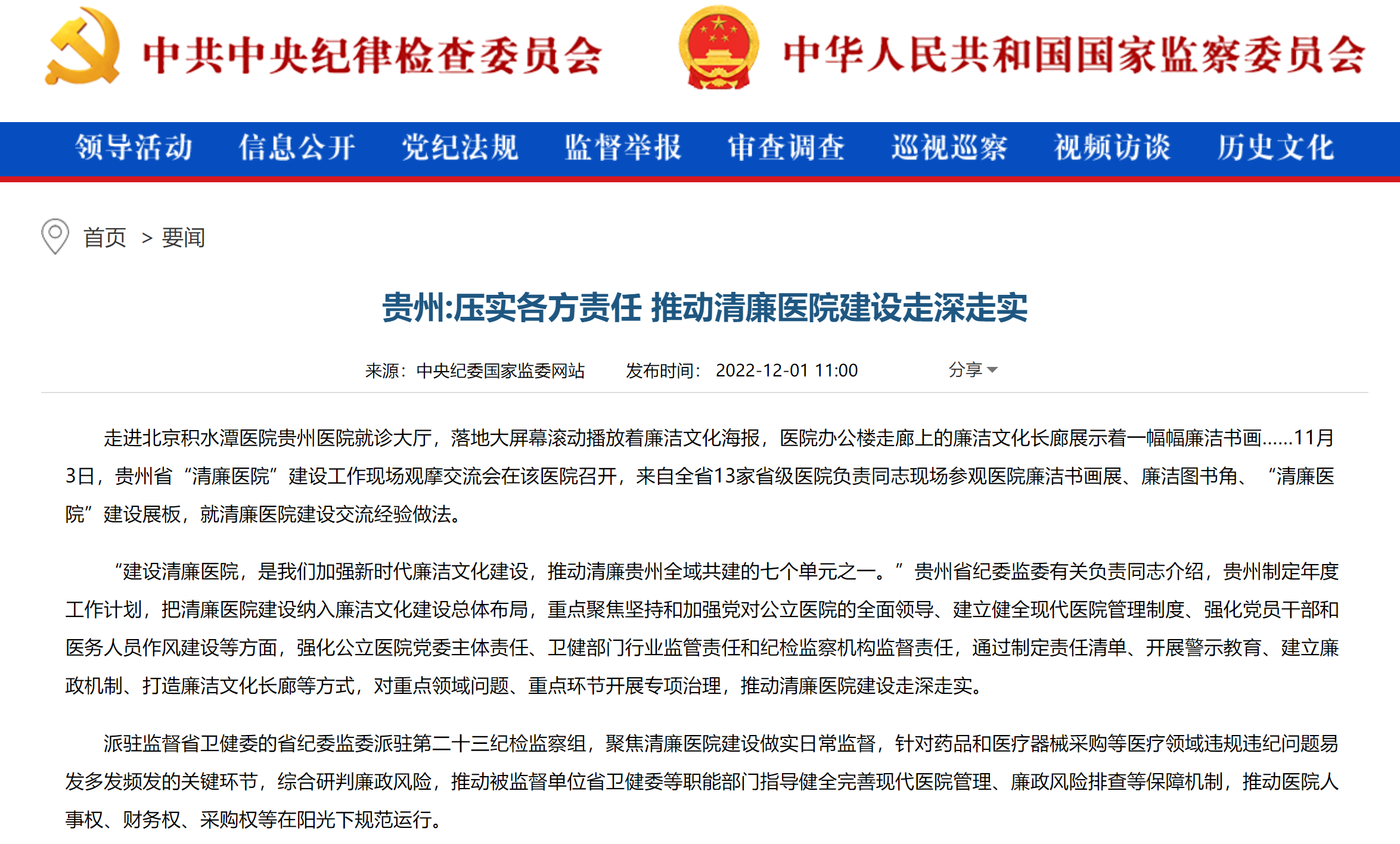“建设清廉医院,是我们加强新时代廉洁文化建设,推动清廉贵州全域共建的七个单元之一。”贵州省纪委监委有关负责同志介绍,贵州制定年度工作计划,把清廉医院建设纳入廉洁文化建设总体布局,重点聚焦坚持和加强党对公立医院的全面领导、建立健全现代医院管理制度、强化党员干部和医务人员作风建设等方面,强化公立医院党委主体责任、卫健部门行业监管责任和纪检监察机构监督责任,通过制定责任清单、开展警示教育、建立廉政机制、打造廉洁文化长廊等方式,对重点领域问题、重点环节开展专项治理,推动清廉医院建设走深走实。