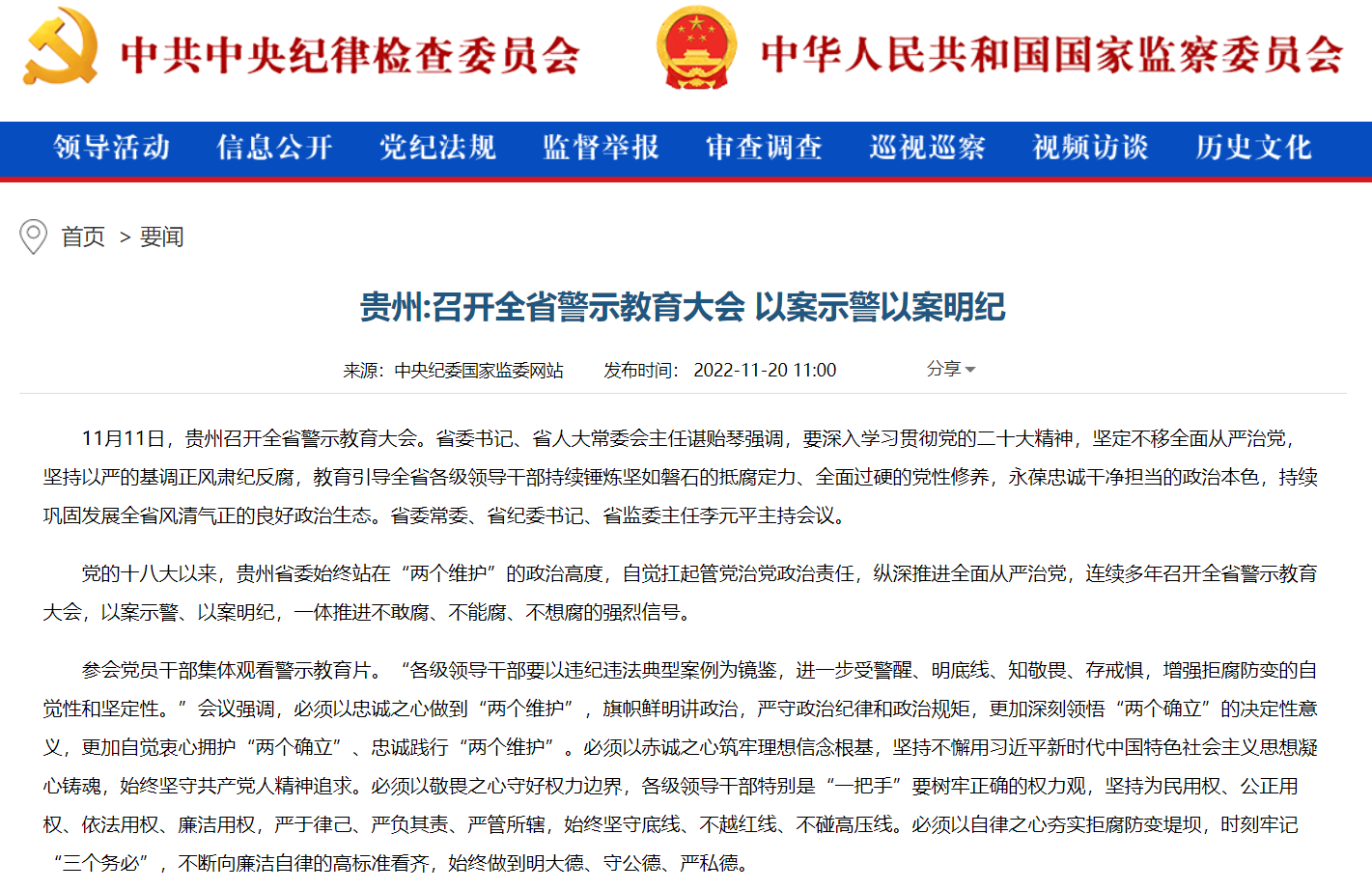 党的十八大以来,贵州省委始终站在“两个维护”的政治高度,自觉扛起管党治党政治责任,纵深推进全面从严治党,连续多年召开全省警示教育大会,以案示警、以案明纪,一体推进不敢腐、不能腐、不想腐的强烈信号。