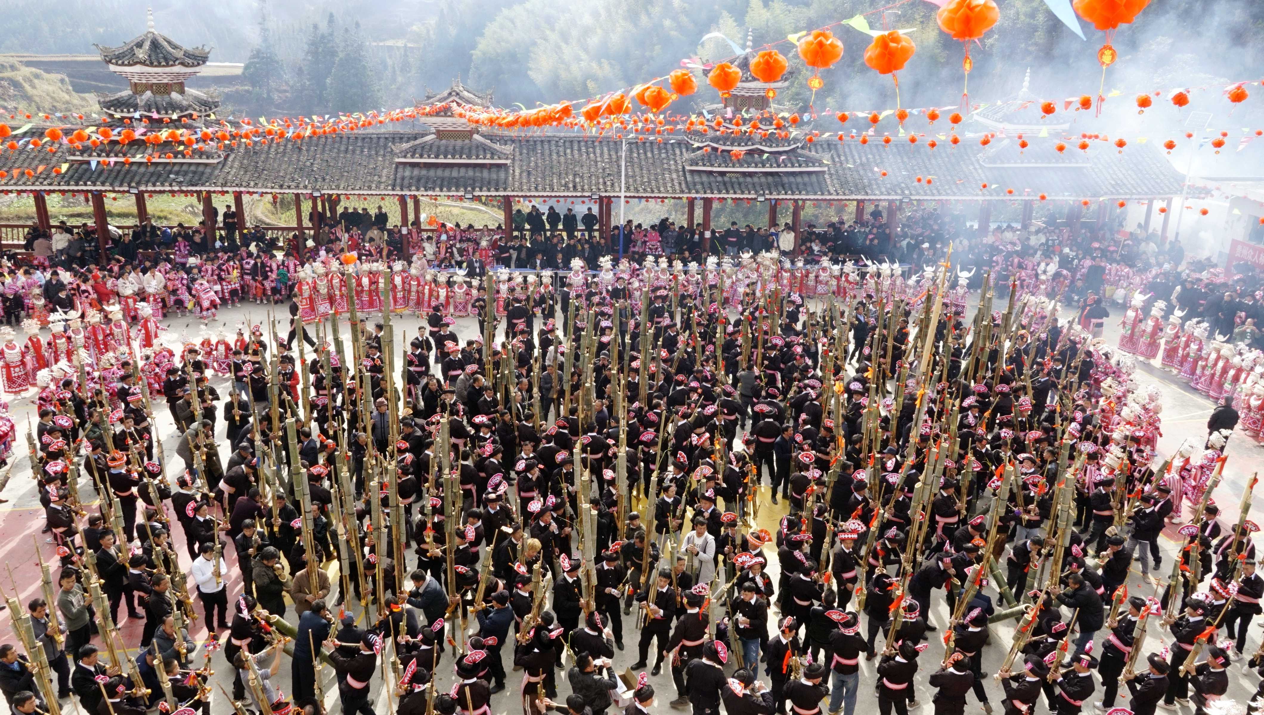 鸡爬田跳年场活动是省级非遗代表项目。在贵阳市清镇市麦格苗族布依族乡鸡爬田,来自全省十九个村寨的“四印”少数民族同胞聚集在此,共同祈福平安幸福。(贵阳市清镇市纪委监委供 朱进 摄)