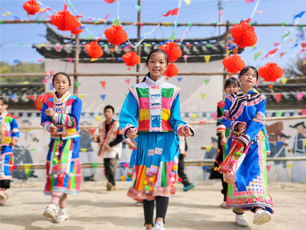 正月十五,又是一年元宵时。云南省龙陵县龙新乡小米地灯笼高挂,彩旗飘扬,一派热闹景象。广场上,傈僳族群众以“打歌”的形式欢庆佳节,也为新的一年祈福纳祥。(云南省龙陵县纪委监委供 王龙芹 摄)
