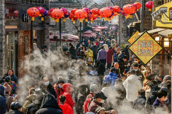 元宵节前后,宁波市海曙区南塘老街烟火气十足,大街小巷张灯结彩,喜庆祥和。图为该区南塘老街举办“红火迎春”宁波文旅消费集市活动,人流如潮。(宁波市海曙区纪委监委供 易国庆 摄)