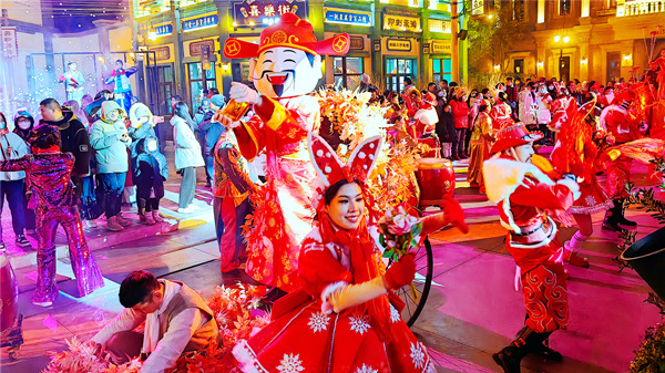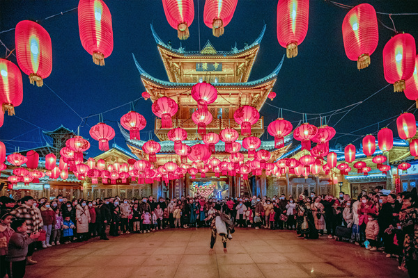 祈福新春,喜迎元宵。江苏省淮安市方特景区张灯结彩、鼓声阵阵,“花戏”、“旱船”、舞狮等大型民俗活动轮番上演,让游客在游玩中感受热闹欢乐的节日氛围。(江苏省金湖县纪委监委供 倪春霏 摄)