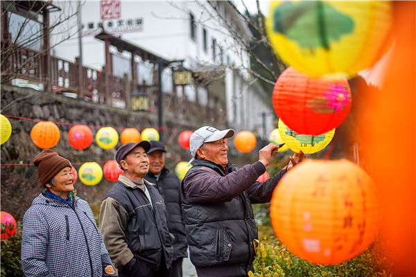 杭州市淳安县金峰乡开展“新春闹元宵”猜灯谜送祝福活动,群众们在文化广场里挂灯笼、写祝福、猜灯谜,感受传统节日和文化的魅力。(杭州市淳安县纪委监委供 谢航凯 摄)