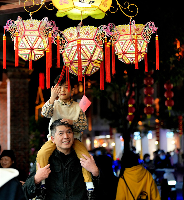 福建省泉州市中山路人流熙熙攘攘,街上挂满了色彩鲜艳的灯笼,有小兔灯笼、萤火虫灯笼、风车灯笼,在红砖古厝的映衬下,绘就成了一幅元宵节美丽的画卷。(福建省泉州市纪委监委供 李火碰 摄)