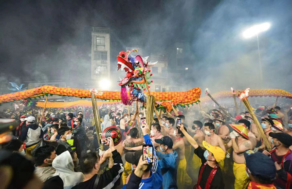 元宵节前夕,广西壮族自治区南宁市宾阳县举办一年一度的“炮龙节”活动,吸引着四面八方的游客前来看民俗、赏非遗、品美食,热热闹闹欢庆元宵佳节。图为民间艺人正在进行舞炮龙表演。(广西壮族自治区宾阳县纪委监委供 曾祥忠 摄)