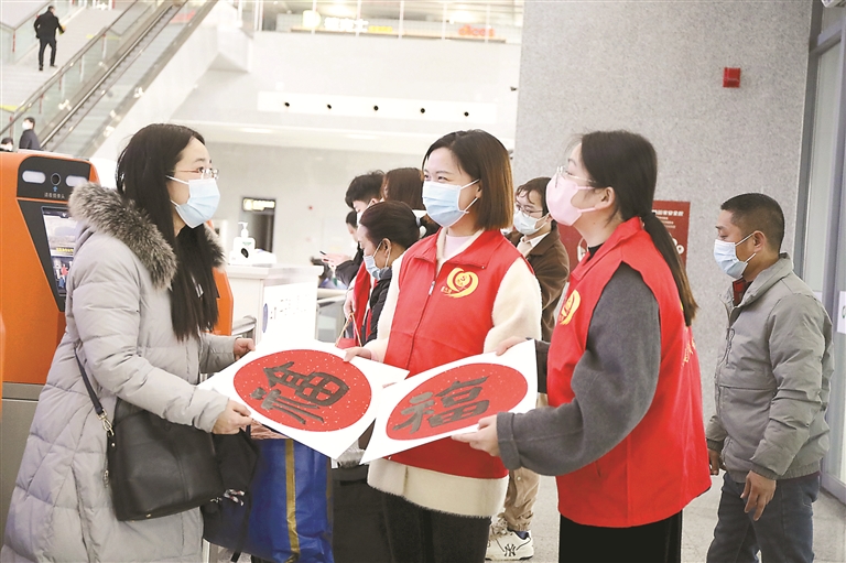 1月13日,杭州,党员志愿者在桐庐高铁站为旅客送“福”字。(图片来源:视觉中国)