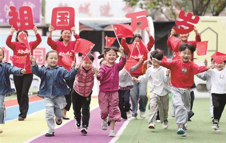 国庆、中秋双节将至,人们参加丰富多彩的活动,喜迎佳节。图为9月26日,山东省临沂市郯城县郯城街道官塘幼儿园的老师和孩子进行课间“快乐跑”。 新华社发(张春雷 摄)