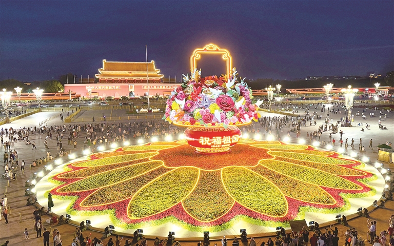 近日,天安门广场中心“祝福祖国”大花篮亮相。大花篮里灵动的鸽子展翅欲飞,与篮中满载的鲜花相映成趣,共同勾勒出一幅和平发展、欣欣向荣的时代画卷。图为近日在天安门广场拍摄的“祝福祖国”大花篮夜景。 新华社发