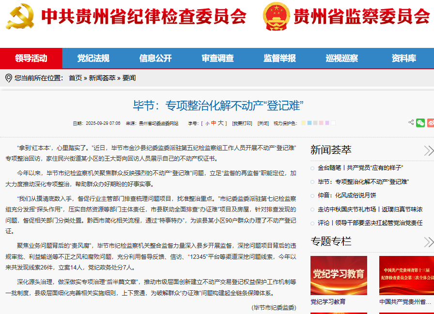 今年以来,毕节市纪检监察机关聚焦群众反映强烈的不动产“登记难”问题,立足“监督的再监督”职能定位,加大力度推动深化专项整治,帮助群众办好期盼的好事实事。