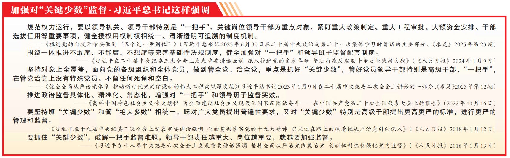 全面从严治党关键是要抓住领导干部这个“关键少数”。我们聚焦这一核心任务,着力加强对权力配置和运行的制约监督,推动健全授权用权制权相统一、清晰透明可追溯的制度机制。实践中,我们深入开展专题调研,加强类案分析,剖析“关键少数”违纪违法行为的典型特征与深层根源。针对暴露出的问题,坚持靶向施治,推动建章立制,从源头上压缩“关键少数”权力寻租空间,规范权力运行。比如,针对近年来查办的多起招标投标、工程建设领域严重违纪违法案件,推动职能部门建立并完善覆盖工程建设项目决策、审批、实施、验收全周期管理的制度体系;专门制发领导干部插手干预重大事项记录报告规定,为监督“关键少数”用权行为提供了具体抓手。在织密扎牢制度笼子的基础上,我们紧盯“关键少数”遵守和执行制度情况,严肃查处打折扣、搞变通等行为,对全市各单位开展督查,推动整改。通过强化监督检查,纠治制度“空转”问题,确保将制度的规范效力真正转化为对“关键少数”的刚性约束,实现有效监督。(安徽省马鞍山市委常委,市纪委书记、监委代主任 陈红星)