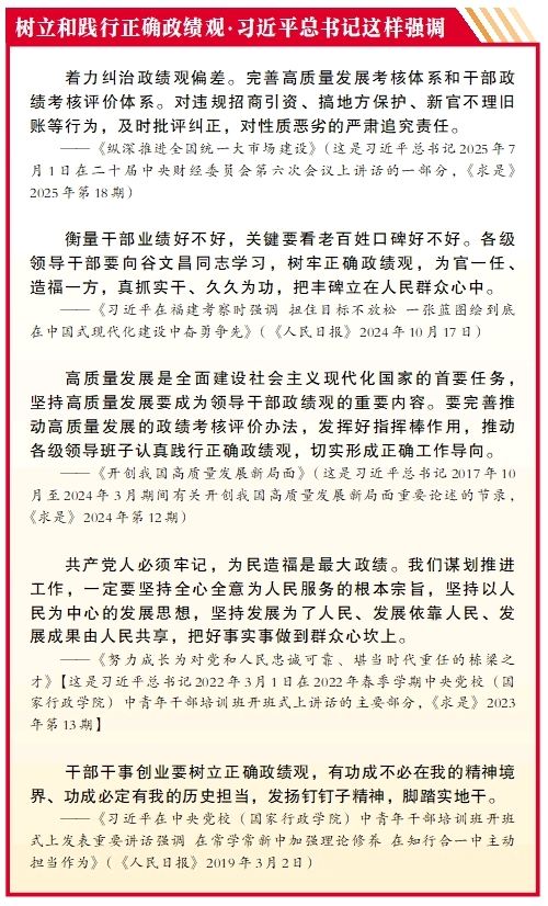 党的二十届四中全会审议通过的“十五五”规划建议明确提出“树立和践行正确政绩观”。新征程上,广大党员干部要牢固树立和践行正确政绩观,把对党忠诚、为党分忧、为党尽职、为民造福作为根本政治担当,保持平和心态,看淡个人进退得失,心无旁骛努力工作,为党和人民做事,创造无愧于党、无愧于人民、无愧于时代的业绩。