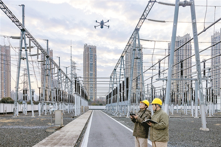 2月17日,国网泰州供电公司运维人员在220千伏寺巷变电站利用无人机巡检电力设备。 新华社发(汤德宏 摄)