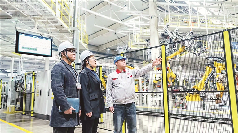 安徽省芜湖市纪委监委紧紧围绕贯彻新发展理念、发展新质生产力等党中央重大决策部署,强化监督执纪,护航经济社会高质量发展。图为该市纪检监察干部在一家企业的智造工厂车间走访,了解相关政策落实情况。 杜广明 摄