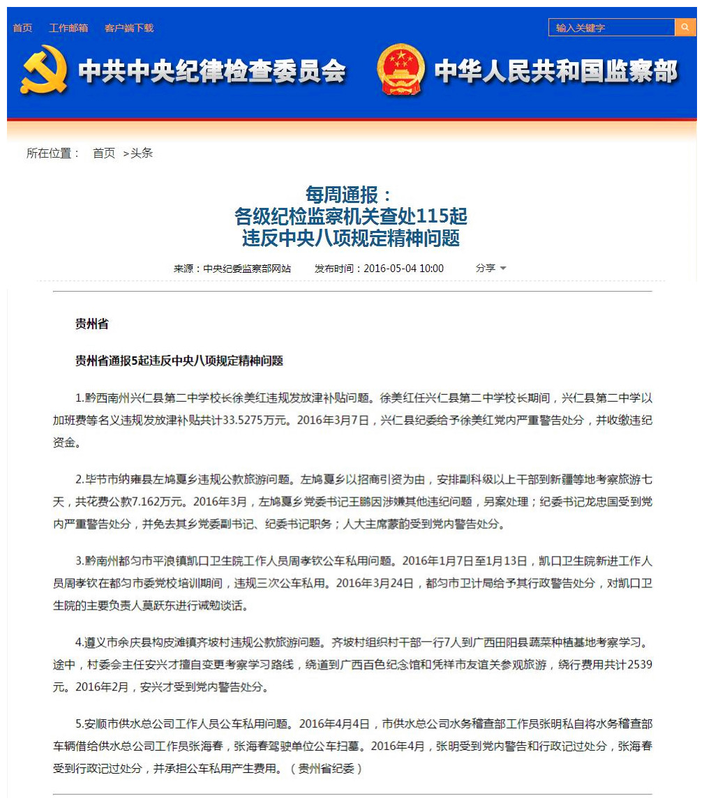 2016年5月4日中央纪委监察部网站头条
