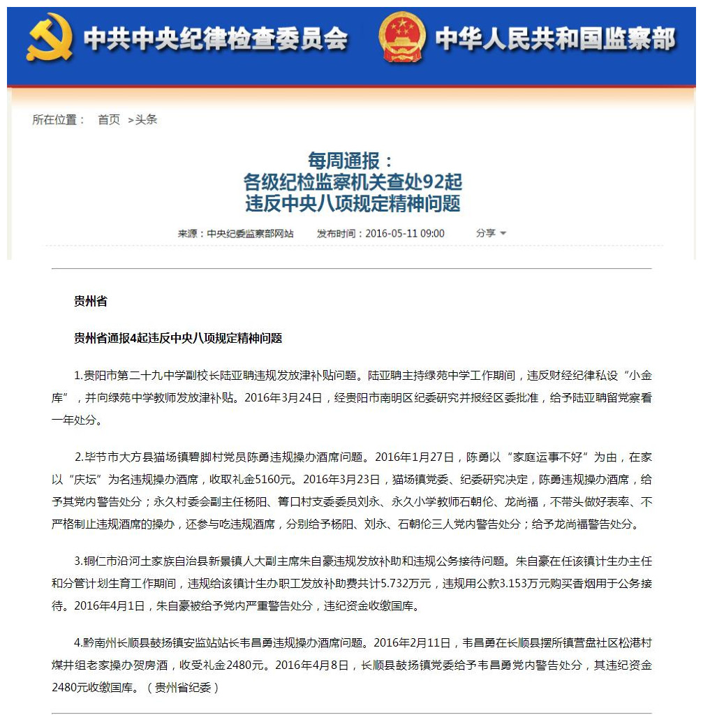 每周通报:贵州省通报4起违反中央八项规定精神问题