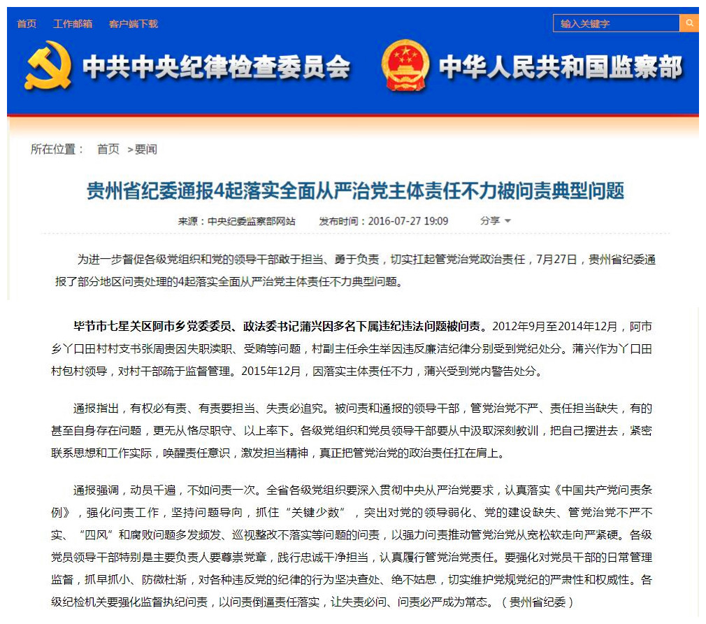 贵州省纪委通报4起落实全面从严治党主体责任不力被问责典型问题