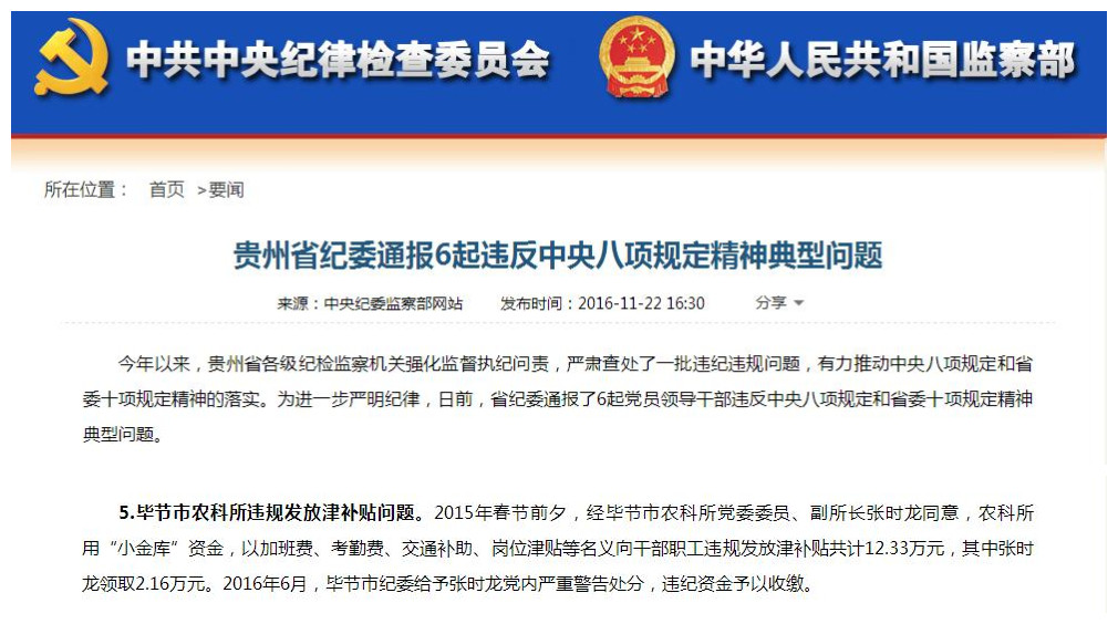 贵州省纪委通报6起违反中央八项规定精神典型问题