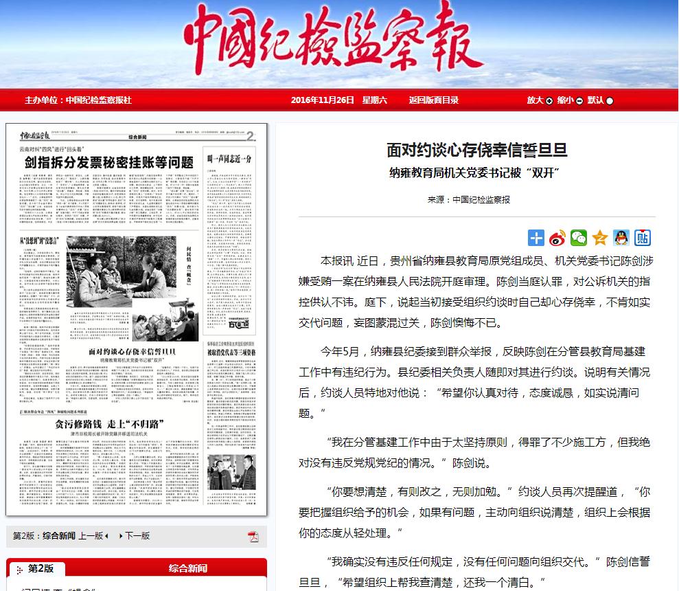 本报讯 近日,贵州省纳雍县教育局原党组成员、机关党委书记陈剑涉嫌受贿一案在纳雍县人民法院开庭审理。陈剑当庭认罪,对公诉机关的指控供认不讳。庭下,说起当初接受组织约谈时自己却心存侥幸,不肯如实交代问题,妄图蒙混过关,陈剑懊悔不已。