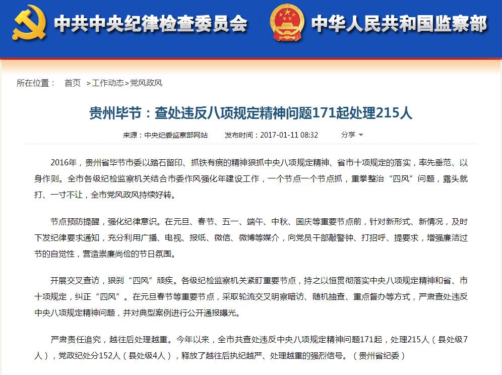 贵州毕节:查处违反八项规定精神问题171起处理215人