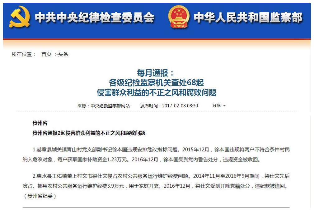 贵州省通报2起侵害群众利益的不正之风和腐败问题