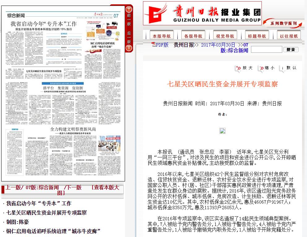 2016年以来,七星关区组织42个民生监督组分别对农村危房改造、信贷扶贫资金、退耕还林、农村安全饮水安全进行专项监察,对国家公职人员、村(居、社区)干部落实惠民政策进行专项清理,严肃查处发生在群众身边的腐败。据统计,2016年,该区通过阳光党务政务网公开的农村低保、城市低保、危房改造、计生扶助、退耕还林等民生资金达10亿元。其中,农村低保金2亿余元,惠及46067户91967人;城市低保金8350万元,惠及11393户26053人。