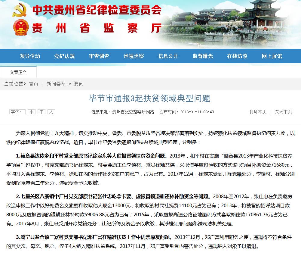 为深入贯彻党的十九大精神,切实推动中央、省委、市委脱贫攻坚各项决策部署落到实处,持续强化扶贫领域监督执纪问责力度,以铁的纪律确保打赢脱贫攻坚战。近日,毕节市纪委监委通报3起扶贫领域典型问题,分别是: