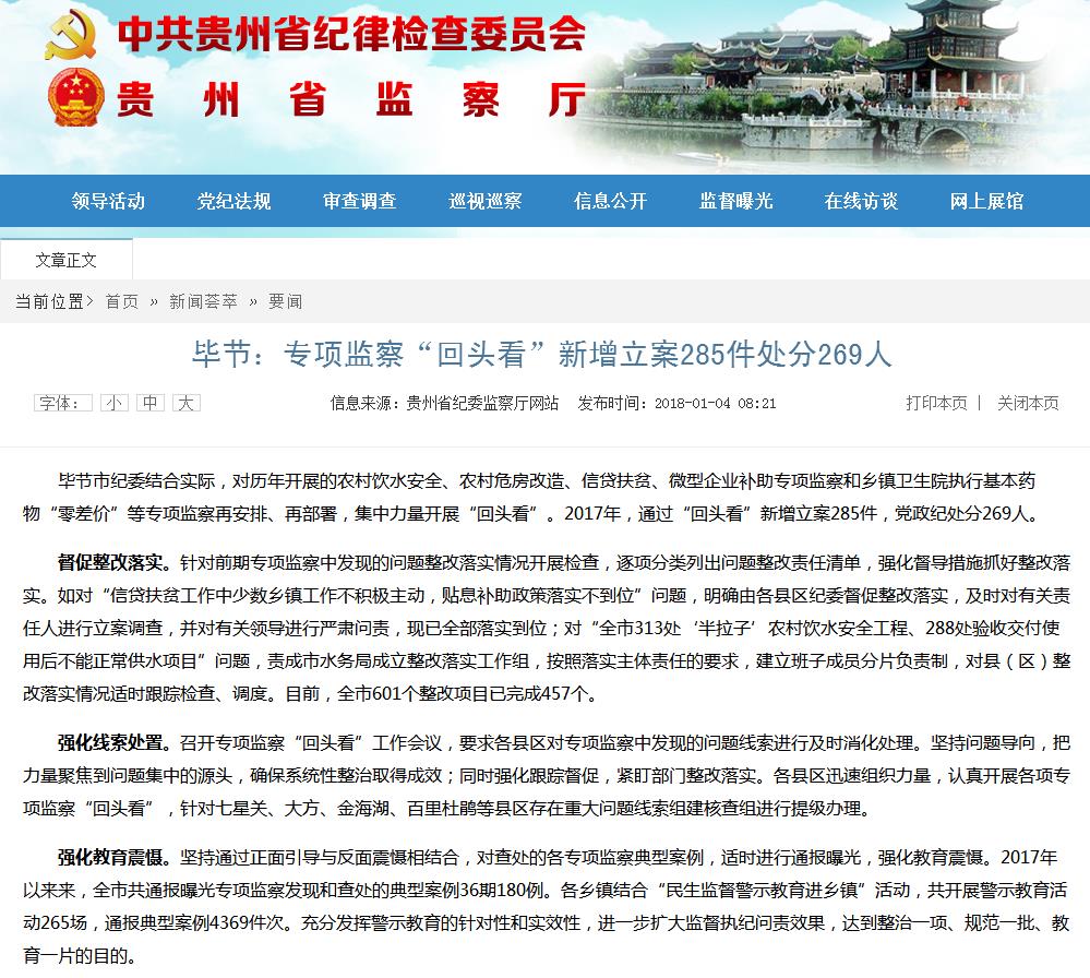 毕节市纪委结合实际,对历年开展的农村饮水安全、农村危房改造、信贷扶贫、微型企业补助专项监察和乡镇卫生院执行基本药物“零差价”等专项监察再安排、再部署,集中力量开展“回头看”。2017年,通过“回头看”新增立案285件,党政纪处分269人。