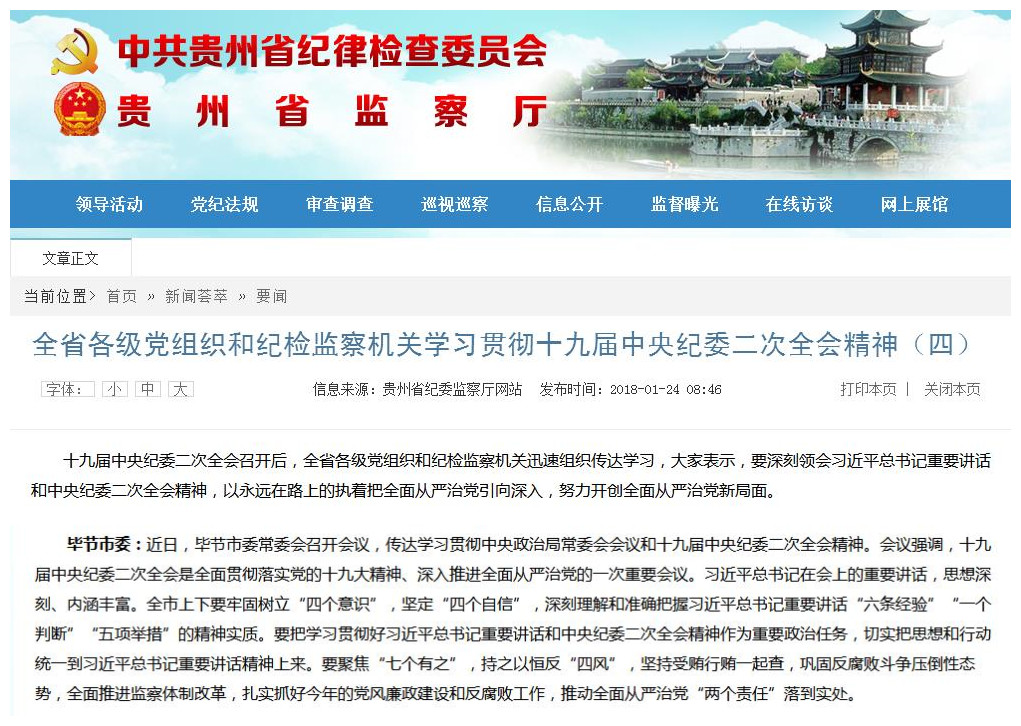 十九届中央纪委二次全会召开后,全省各级党组织和纪检监察机关迅速组织传达学习,大家表示,要深刻领会习近平总书记重要讲话和中央纪委二次全会精神,以永远在路上的执着把全面从严治党引向深入,努力开创全面从严治党新局面。