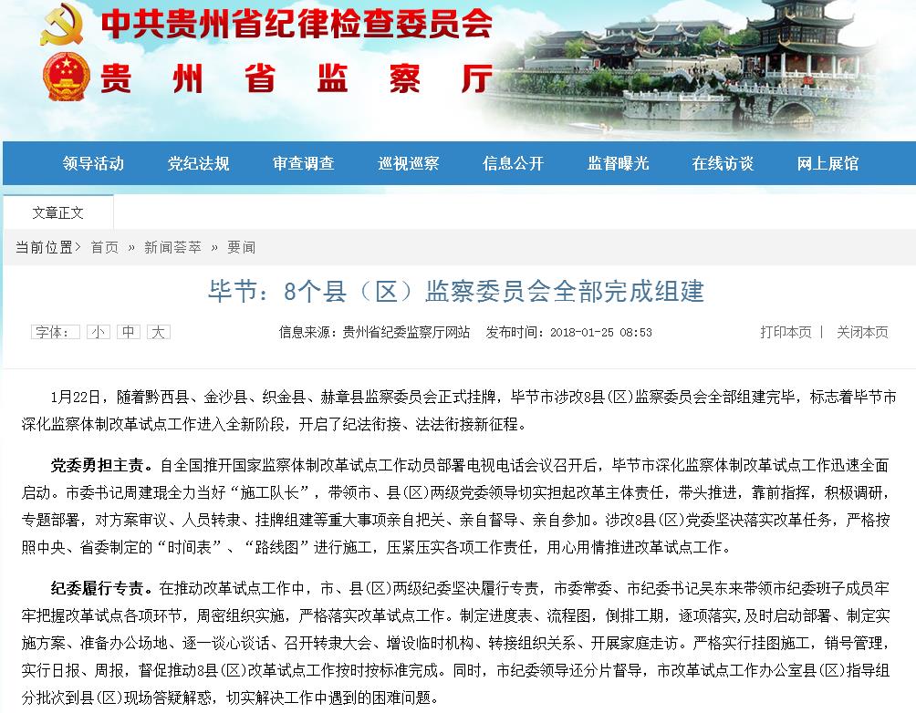1月22日,随着黔西县、金沙县、织金县、赫章县监察委员会正式挂牌,毕节市涉改8县(区)监察委员会全部组建完毕,标志着毕节市深化监察体制改革试点工作进入全新阶段,开启了纪法衔接、法法衔接新征程。