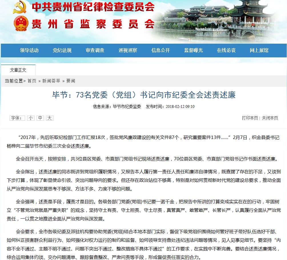 贵州省纪委监察厅网站:毕节:73名党委(党组)书记向市纪委全会述责述廉