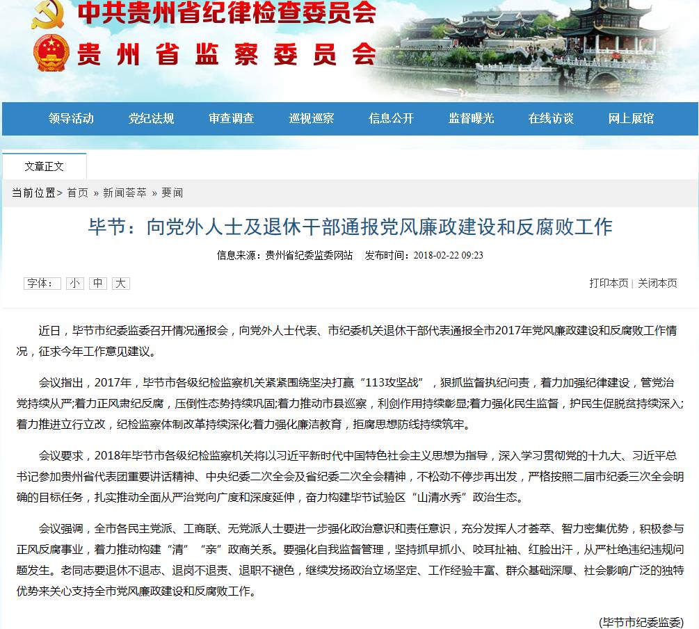 贵州省纪委监委网站:毕节:向党外人士及退休干部通报党风廉政建设和反腐败工作