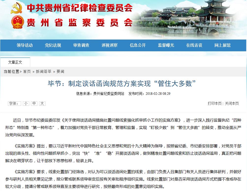 贵州省纪委监委网站:毕节:制定谈话函询规范方案实现“管住大多数”