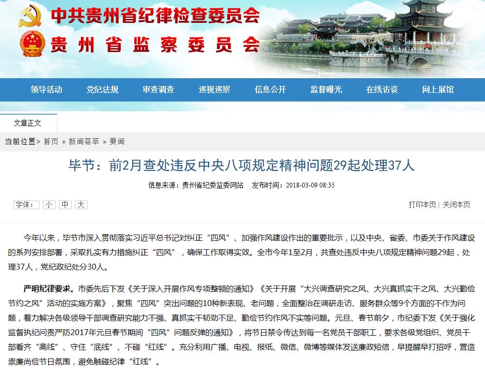 贵州省纪委监委网站:毕节:前2月查处违反中央八项规定精神问题29起处理37人
