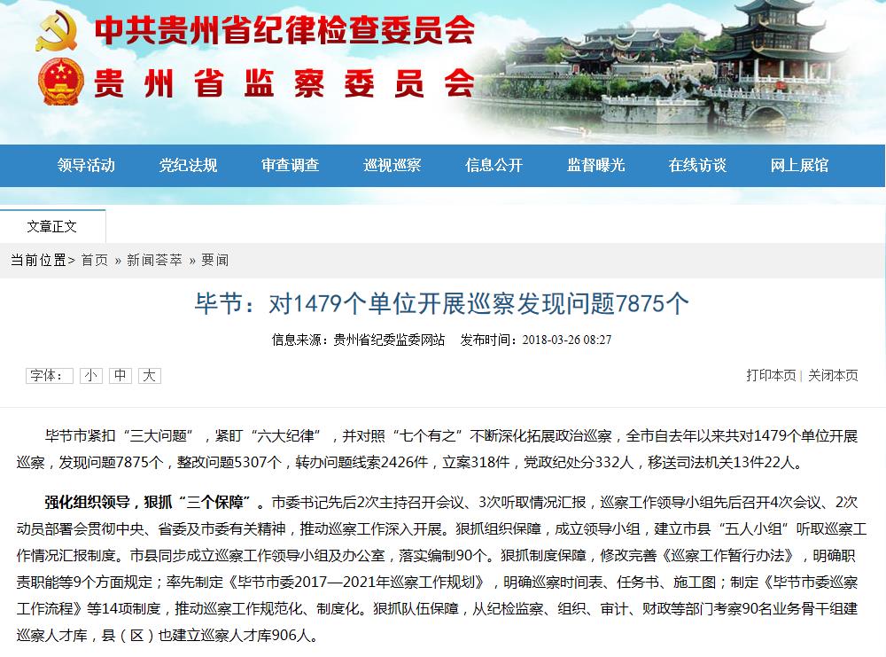 贵州省纪委监委网站:毕节:对1479个单位开展巡察发现问题7875个