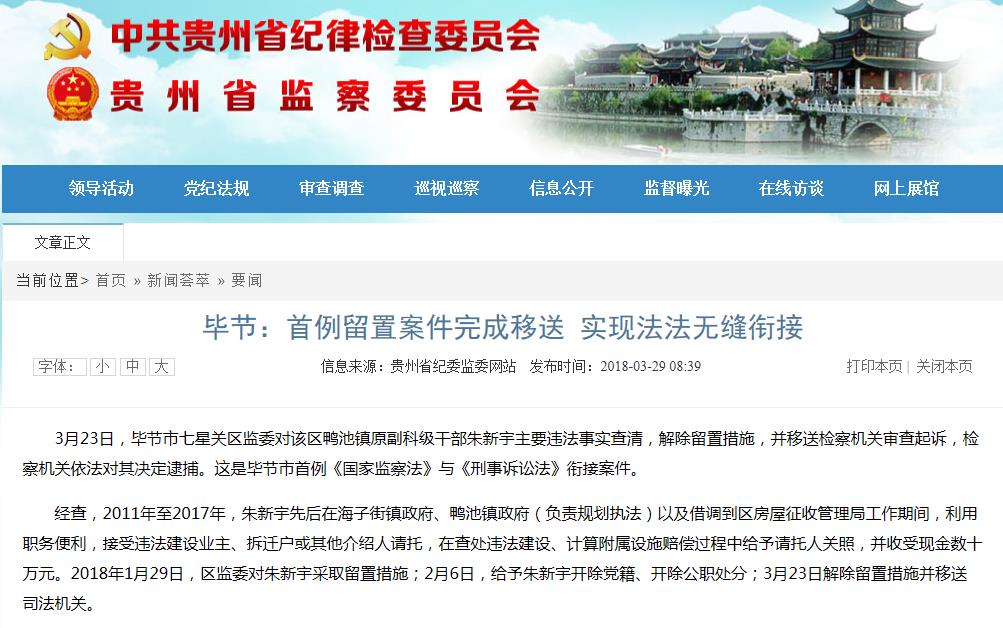 3月23日,毕节市七星关区监委对该区鸭池镇原副科级干部朱新宇主要违法事实查清,解除留置措施,并移送检察机关审查起诉,检察机关依法对其决定逮捕。这是毕节市首例《国家监察法》与《刑事诉讼法》衔接案件。