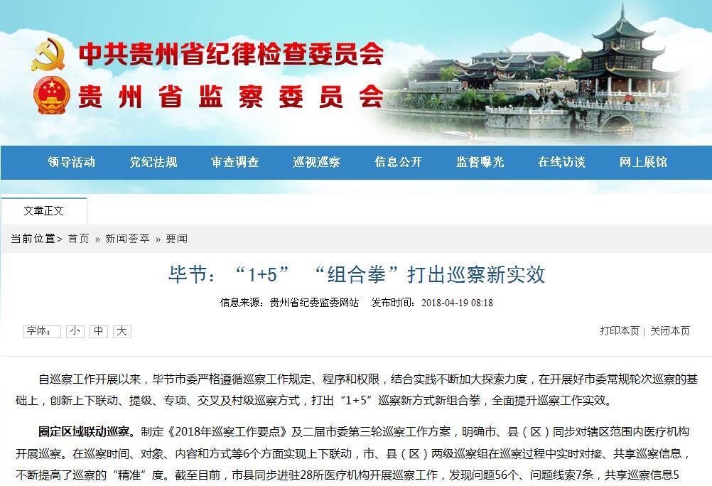 自巡察工作开展以来,毕节市委严格遵循巡察工作规定、程序和权限,结合实践不断加大探索力度,在开展好市委常规轮次巡察的基础上,创新上下联动、提级、专项、交叉及村级巡察方式,打出“1+5”巡察新方式新组合拳,全面提升巡察工作实效。