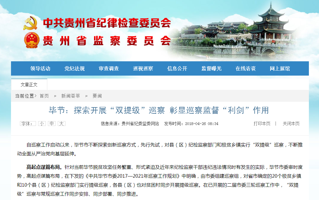 自巡察工作启动以来,毕节市不断探索创新巡察方式,先行先试,对县(区)纪检监察部门和极贫乡镇实行“双提级”巡察,不断推动全面从严治党向基层延伸。