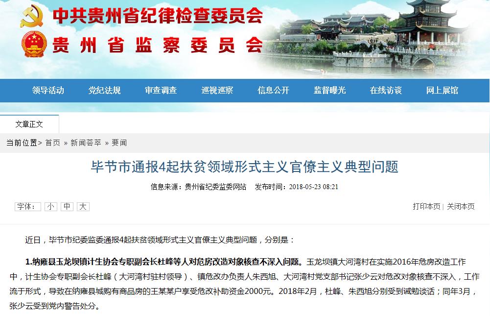 1.纳雍县玉龙坝镇计生协会专职副会长杜峰等人对危房改造对象核查不深入问题。玉龙坝镇大河湾村在实施2016年危房改造工作中,计生协会专职副会长杜峰(大河湾村驻村领导)、镇危改办负责人朱西旭、大河湾村党支部书记张少云对危改对象核查不深入,工作流于形式,导致在纳雍县城购有商品房的王某某户享受危改补助资金2000元。2018年2月,杜峰、朱西旭分别受到诫勉谈话;同年3月,张少云受到党内警告处分。