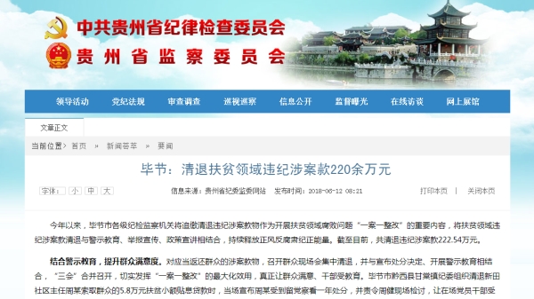 今年以来,毕节市各级纪检监察机关将追缴清退违纪涉案款物作为开展扶贫领域腐败问题“一案一整改”的重要内容,将扶贫领域违纪涉案款清退与警示教育、举报宣传、政策宣讲相结合,持续释放正风反腐肃纪正能量。截至目前,共清退违纪涉案款222.54万元。
