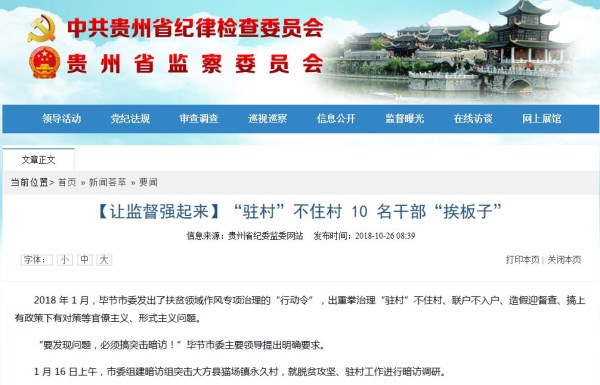 2018 年 1 月,毕节市委发出了扶贫领域作风专项治理的“行动令”,出重拳治理“驻村”不住村、联户不入户、造假迎督查、搞上有政策下有对策等官僚主义、形式主义问题。