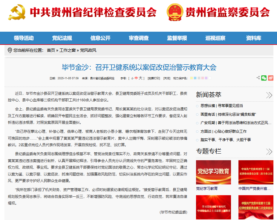 近日,毕节市金沙县召开卫健系统以案促改促治警示教育大会,县卫健局党委班子成员及机关干部职工,县疾控中心、县中心血库等二级机构干部职工共计160余人参加会议。