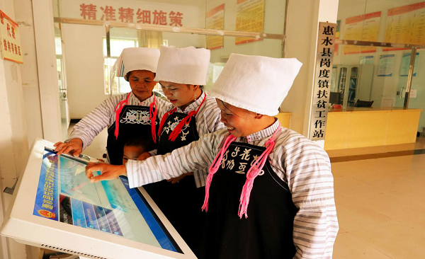 黔南州纪委监委抢抓贵州省大数据发展机遇,找准大数据和纪检监察工作的契合点,构建了“大数据+民生、扶贫、巡察、警示教育、疫情防控”监督格局,让监督插上科技翅膀,推动实现监督执纪问责信息化、精准化、高效化。图为该州惠水县岗度镇少数民族群众正在扶贫民生领域监督大数据平台终端查询一体机查询自家民生资金补助情况