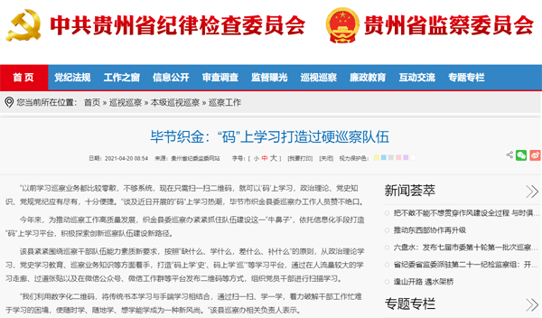 “以前学习巡察业务都比较零散,不够系统,现在只需扫一扫二维码,就可以‘码’上学习,政治理论、党史知识、党规党纪应有尽有,十分便捷。”谈及近日开展的“码”上学习热潮,毕节市织金县委巡察办工作人员赞不绝口。